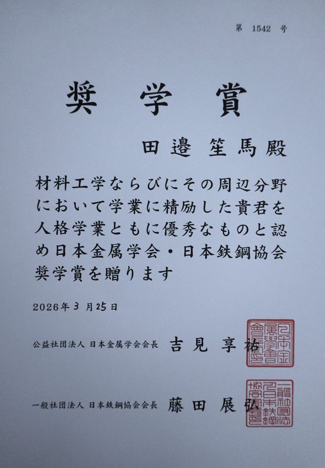 第34回 日本金属学会・日本鉄鋼協会 奨学賞, 田邉笙馬, 2026年3月25日